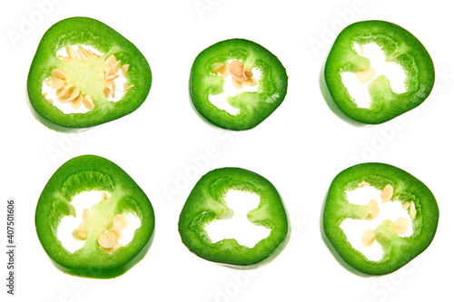 sliced jalapeno peppers isolated on white background. Green chili pepper. Capsicum annuum. top view