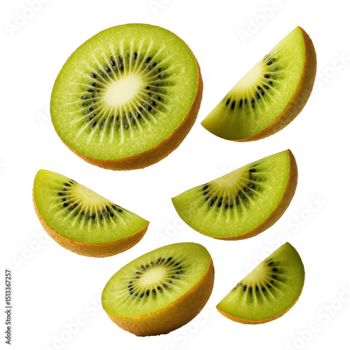 Sliced kiwi fruit arranged on white transparent background