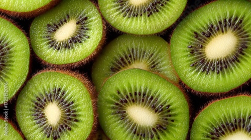 Sliced kiwi fruit showing seeds and flesh filling frame