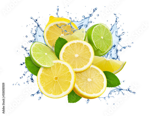 Sliced Lemon and Lime in Splash of Water, isolated on transparent background