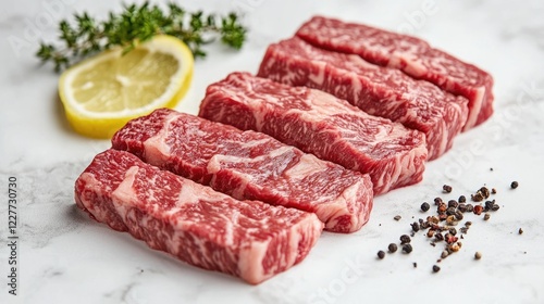 Sliced marbled steak with herbs and lemon on a white marble surface for gourmet cooking and culinary presentations