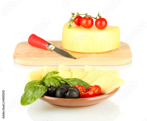 sliced mozzarella cheese with vegetables in the plate isolated