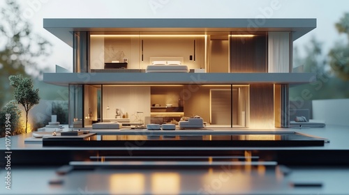 Sliced open 3D house with visible floors, revealing bedroom, living room, and kitchen interiors with a contemporary design.