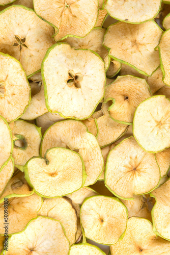 sliced pieces of dried green apples as a background, close-up