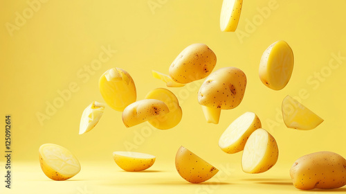 Sliced potatoes float against a vibrant yellow backdrop, capturing the essence of culinary creativity