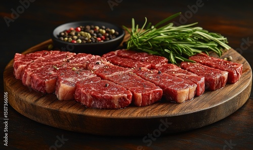 Sliced raw beef steaks on a wooden board with spices and herbs