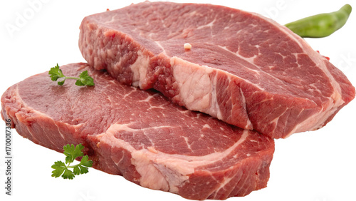 sliced raw pork meat with rosemary and peppercorn isolated on white background