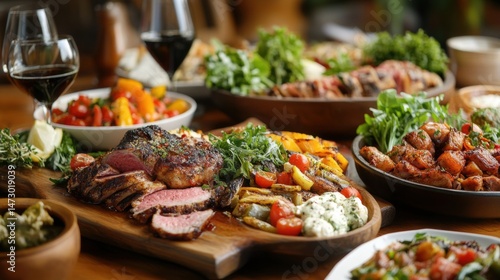 Sliced Roasted Beef Served with Grilled Vegetables and Salad Displayed on a Wooden Table