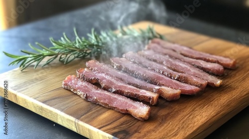 Sliced Smoked Meat on Wooden Platter with Rosemary Garnish in a Rustic Kitchen Setting Highlighting Culinary Art at Home