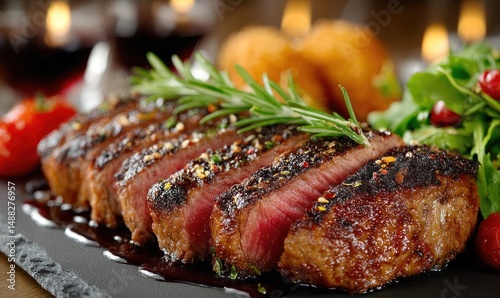 Sliced steak with rosemary garnish served with salad and fried balls.
