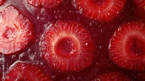Sliced strawberries float in red jelly; close-up, overhead shot, food background, recipe use