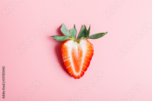 Sliced strawberry berry on a pink background. summer concept. Minimalism, copy space.