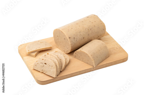 Sliced Vietnamese Pork Sausage on wood plate isolated on white background with Clipping Path