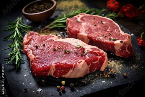 Slices of beef on a fresh red table, processed grilled meat and so there is empty space for text, greetings, wallpaper, posters, advertisements, etc.