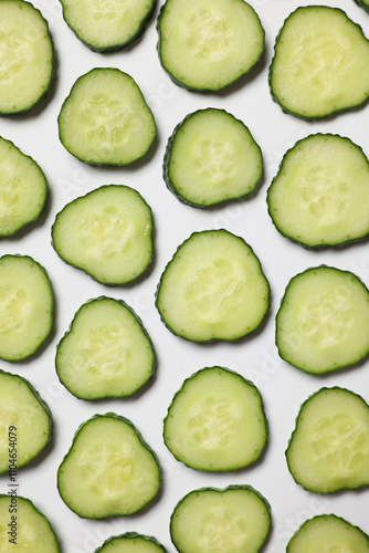 Slices of fresh cucumbers on white background, flat lay