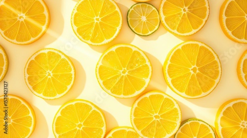 Slices of fresh yellow lemons and lime arranged on a light yellow background