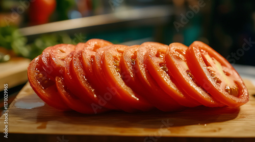Slices of ripe tomatoes on a wooden cutting board in the kitchen