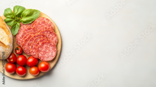Slices of salami are arranged on a wooden board with crusty bread, tomatoes, and basil