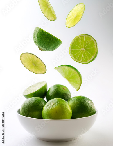 slices or chunks of lime fruit in a white bowl with chunks or slices floating or flying isolated white background