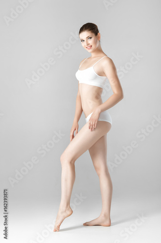 slim beautiful woman with perfect body in white lingerie on gray background. smooth skin