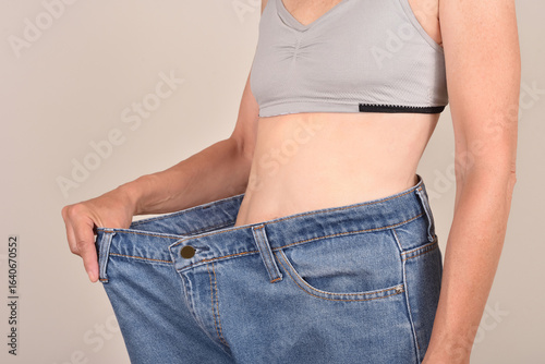 Slim mature woman wearing oversize jeans on the pale brown background. Body fit, dieting and weight loss concept.