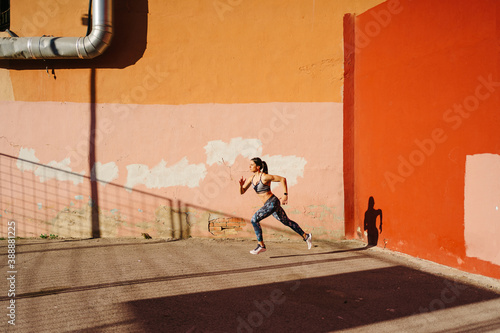 Slim sportswoman running against weathered wall