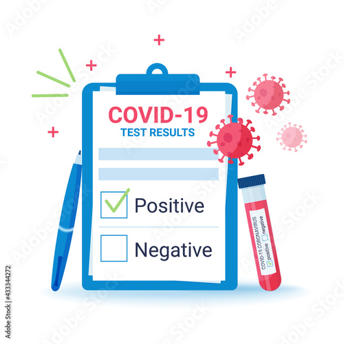 Сlipboard paper Results of the COVID-19 test for coronavirus are positive or negative. Medical infographic.