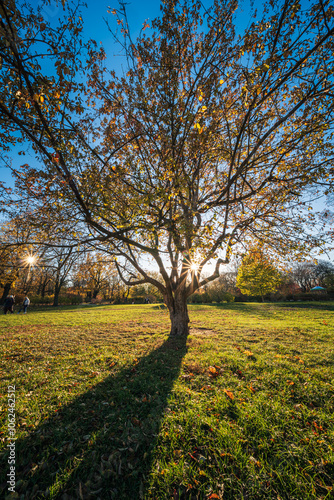 Słońce przebijające się przez kolorowe liście jesiennych drzew