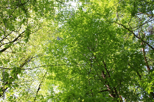 Słońce w gałęziach drzew pokrytych zielonymi, wiosennymi liśćmi