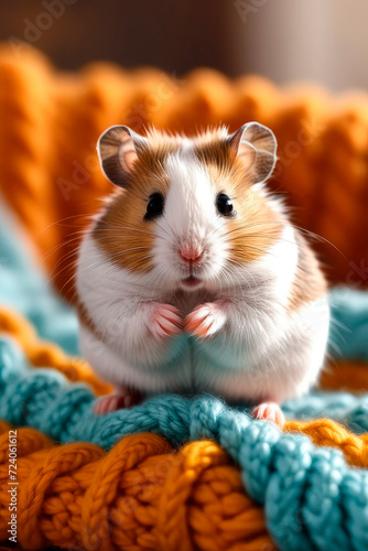 Сlose up hamster resting on sofa under knitted blanket.
