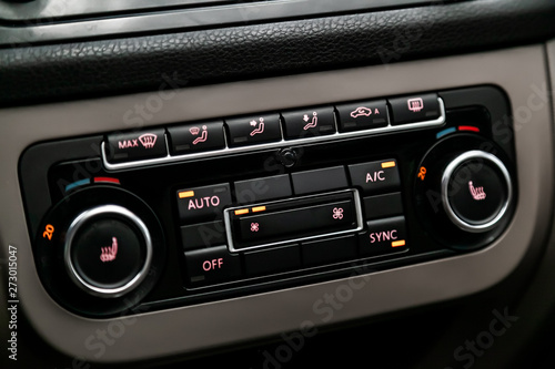 Сlose-up of the car black interior: seat heatting buttons, adjustment of the blower, air conditioner and other buttons.