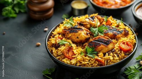 Slow cook rice: Easy cooking. Delicious chicken biryani served in a bowl with vibrant toppings.