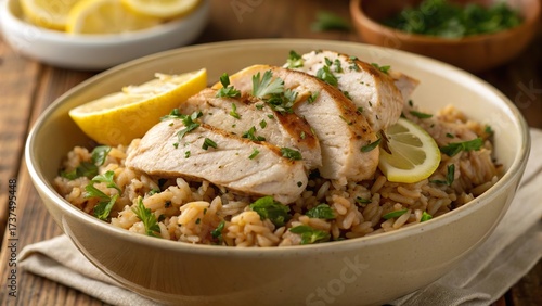 Slow cooked chicken with brown rice garnished with fresh herbs and lemon slices offers a comforting meal idea for any occasion
