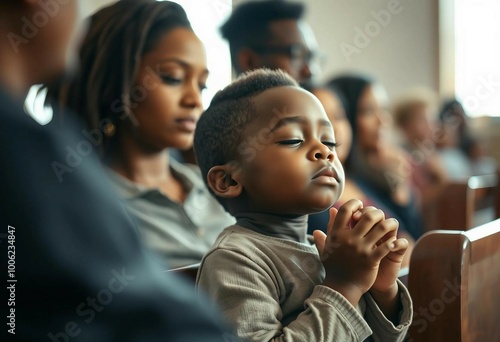 Small African American child praying in a peaceful church setting.