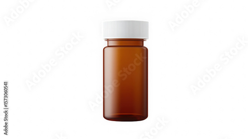 Small amber bottle with white ribbed cap isolated on white background, generic pharmaceutical or supplement container used for product mockups