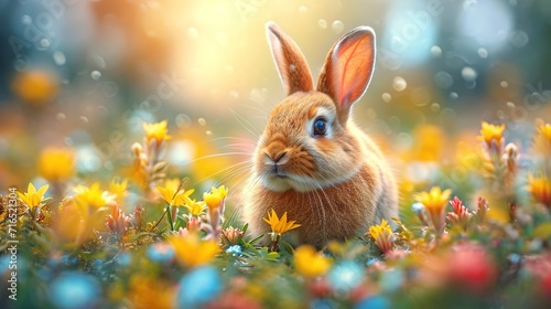 Small ,baby rabbit in easter basket with fluffy fur and easter eggs in the fresh