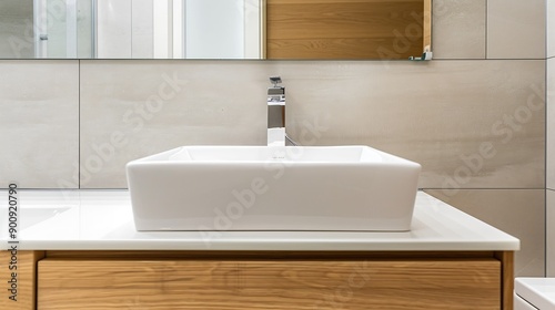 Small bathroom with white porcelain sink on wooden cabinet and frameless square mirror : Generative AI