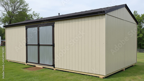 Small beige metal shed standing on grassy farm field