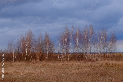 Small birch grove among yellow autumn grasses. Dramatic evening sky above the ground. Bright autumn landscape. Attractive nature.