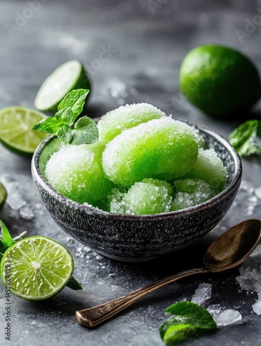 Small black bowl filled with green ice cubes. the ice cubes are covered in a light dusting of sugar, giving them a shiny appearance.