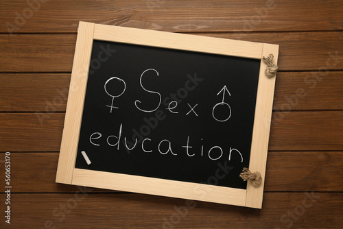 Small black chalkboard with words Sex Education, female and male gender signs on wooden background, top view