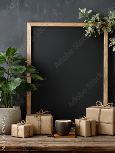 small blank blackboard with coffee plant and small gift boxes no logos no brands ar 34