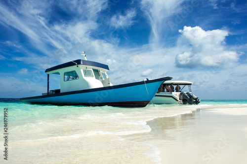 Small boats moored to the shore of an uninhabited island. Paradise tropical island, white sand and clear water