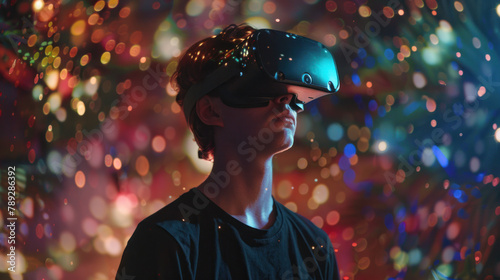 Small boy with virtual reality headset in abstract unreal space, future studying concept