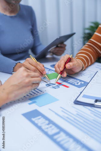 small business accounting team meeting three asian people with salary monthly charts data, basic business accounting and bookkeeping concept.