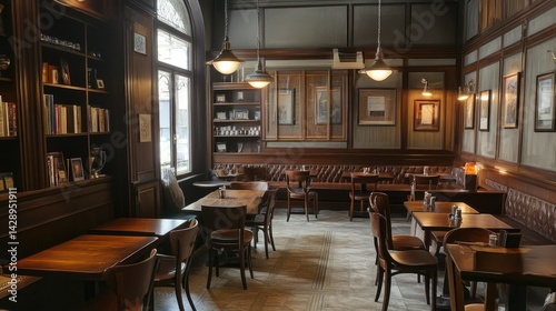 Small cafe lounge with artisanal wood furniture, light grey tones, and hanging industrial lights
