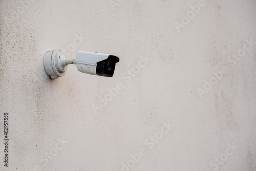 Small CCTV surveillance camera on a light color wall. Security industry, Copy space