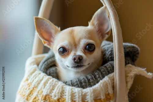 Small chihuahua dog nestled in a soft, knitted bag, creating a heartwarming scene of pet comfort and relaxation