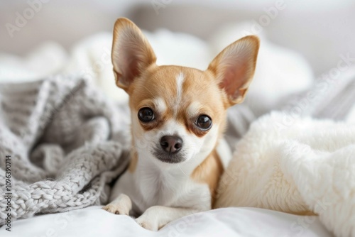 Small chihuahua dog resting on a comfortable bed, enjoying warmth and comfort