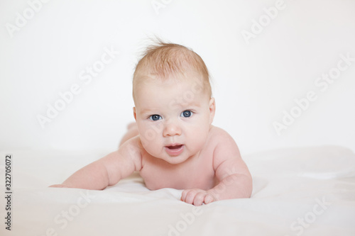 small child, baby lies on his stomach and smiles. On a white background. Newborn baby. three months old baby. A baby of European appearance.